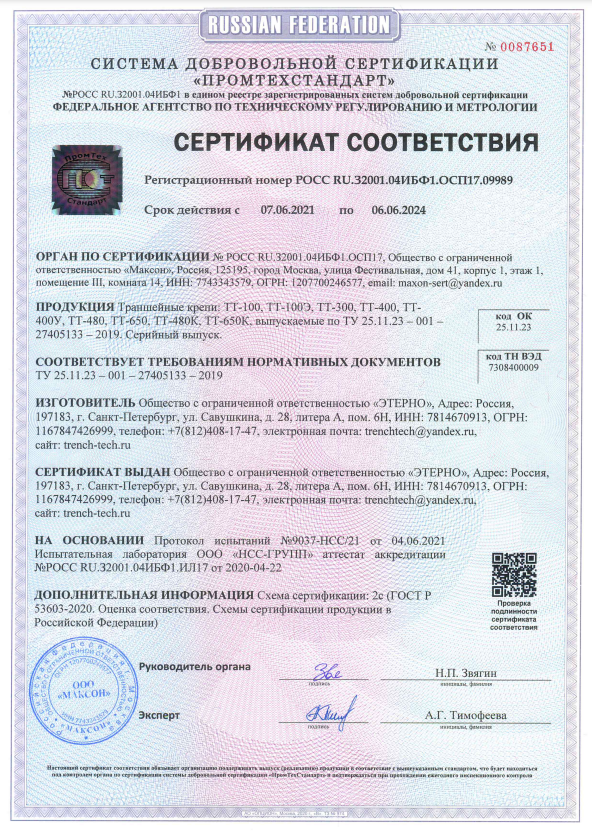 Крепи имеют сертификат соотвествия ТУ, являются надежным инвентарным креплением стенок траншеи в соответствии со СНиП 111-4-80.